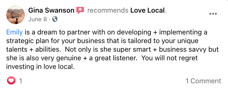 If you are a business owner that needs tangible steps to grow and reach your clientele best, Love Local is seriously for you. My business (and me as a business-owner) benefited a great deal from working with Emily! Whatever you spend will be received back ten-fold from the resources and perspectives you will gain. Run, don't walk, and dive in with Love Local!
