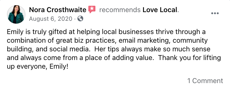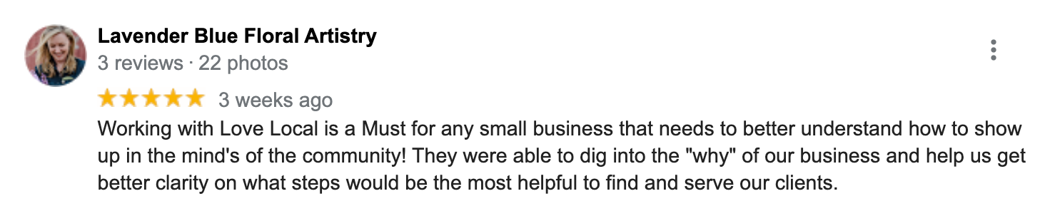 As a small business owner always trying to serve the local community in an engaging way, I absolutely love all of the tips and info Love Local and Emily provide. It's always useful and something I can actually put into action right away! Thanks for uplifting businesses and helping us serve our clients at the next level.